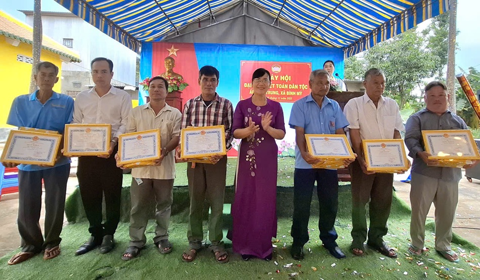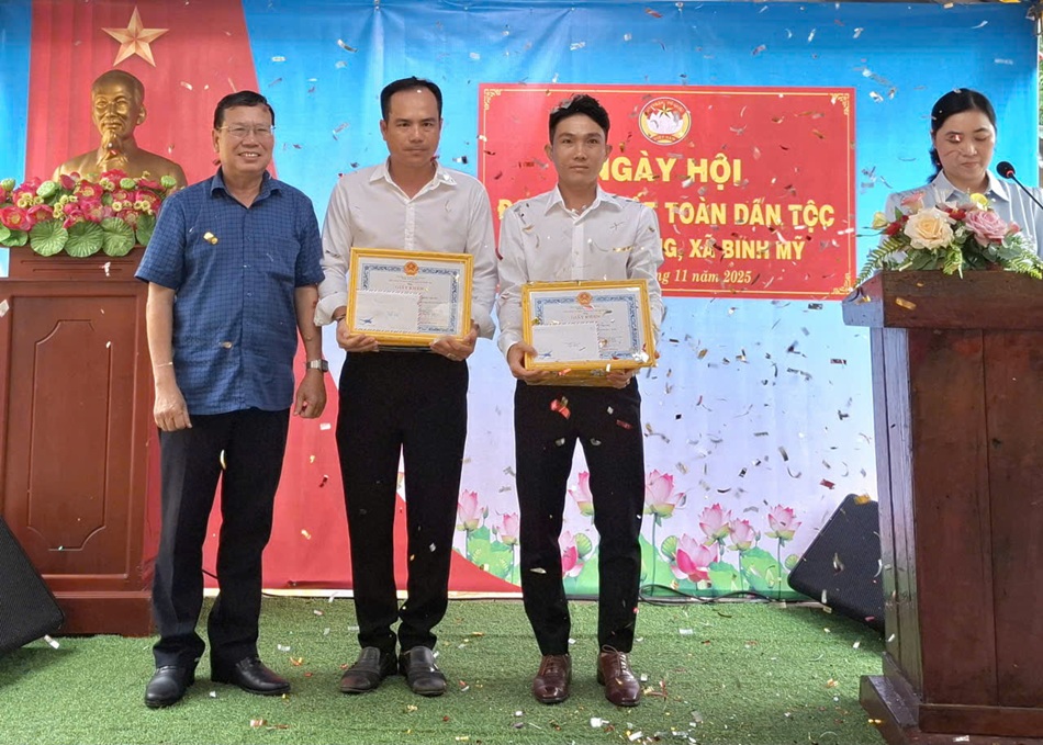 Dịp này, UBND xã Bình Mỹ đã khen thưởng 02 tập thể, 14 cá nhân có thành tích tiêu biểu trong thực hiện Cuộc vận động “Toàn dân đoàn kết xây dựng nông thôn mới, đô thị văn minh” năm 2025; đồng thời trao tặng 10 phần quà cho hộ nghèo, cận nghèo.