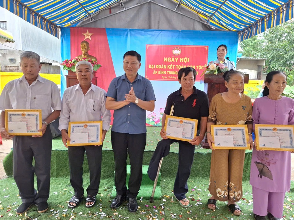 Tại Ngày hội, các đại biểu đã cùng ôn lại truyền thống vẻ vang 95 năm xây dựng và phát triển của Mặt trận Tổ quốc Việt Nam. Ban Công tác Mặt trận ấp Bình Trung báo cáo kết quả thực hiện Cuộc vận động “Toàn dân đoàn kết xây dựng nông thôn mới, đô thị văn minh” năm 2025 với nhiều mô hình, cách làm hay. Nổi bật là vận động nhân dân phát triển kinh tế, giúp nhau giảm nghèo bền vững; vận động cất mới 3 căn nhà Đại đoàn kết, sửa chữa 2 căn nhà cho gia đình có công cách mạng. Trong năm 2025 ấp có 1.095 hộ giữ vững danh hiệu gia đình văn hóa; 100% hộ sử dụng điện sáng; trên 95% hộ có nhà tiêu, nhà tắm đạt vệ sinh. Đến nay, toàn ấp không có hộ đói, đồng thời ấp đã hoàn thành việc xóa nhà tre lá tạm bợ, dột nát cho hộ nghèo theo tiêu chuẩn....