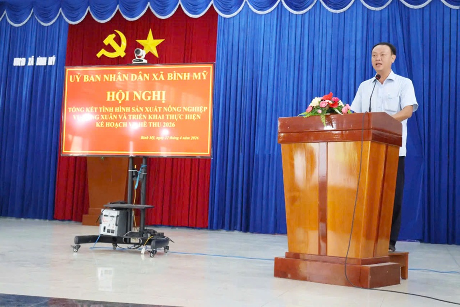 Sáng ngày 22/4/2026,UBND xã Bình Mỹ vừa tổ chức tổng kết tình hình sản xuất nông nghiệp vụ Đông Xuân 2025–2026 và triển khai kế hoạch sản xuất vụ Hè Thu năm 2026. Chủ trì hội nghị có ông Trần Dũ Bình, Phó Chủ tịch UBND xã cùng các ban ngành và Tổ hợp tác, Hợp tác xã, nông dân sản xuất tiêu biểu trên địa bàn xã. Mặc dù chịu nhiều tác động từ biến đổi khí hậu, giá vật tư nông nghiệp tăng cao và thị trường tiêu thụ còn khó khăn, sản xuất nông nghiệp trên địa bàn xã vẫn đạt nhiều kết quả đáng ghi nhận.
