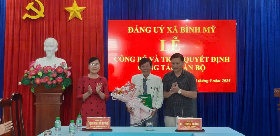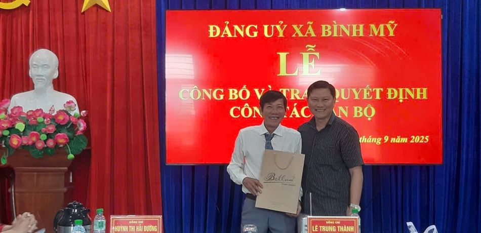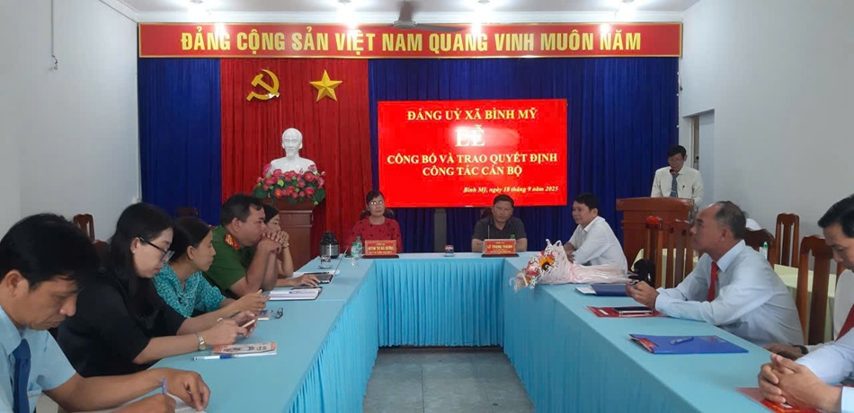 Sáng ngày 18 tháng 9 năm 2025; Ban Thường vụ Đảng ủy xã Bình Mỹ long trọng tổ chức buổi hội nghị trao Quyết định nghỉ hưu trước tuổi cho cán bộ, công chức, Người lao động theo Nghị định số 178/2024/NĐ-CP và trao Quyết định điều động cán bộ. Đến dự có Đồng chí Huỳnh Thị Hải Đường, Phó Bí thư Thường trực Đảng ủy. Đồng chí Lê Trung Thành, Phó Bí thư Đảng ủy- Chủ tịch UBND xã Cùng các đồng chí là Ủy viên Ban Chấp hành Đảng bộ xã, các đồng chí Đại diện lãnh đạo cơ quan tham mưu, giúp việc Đảng ủy, UBND xã.