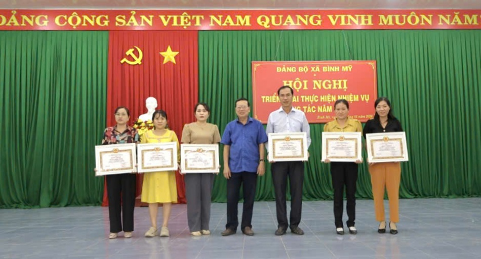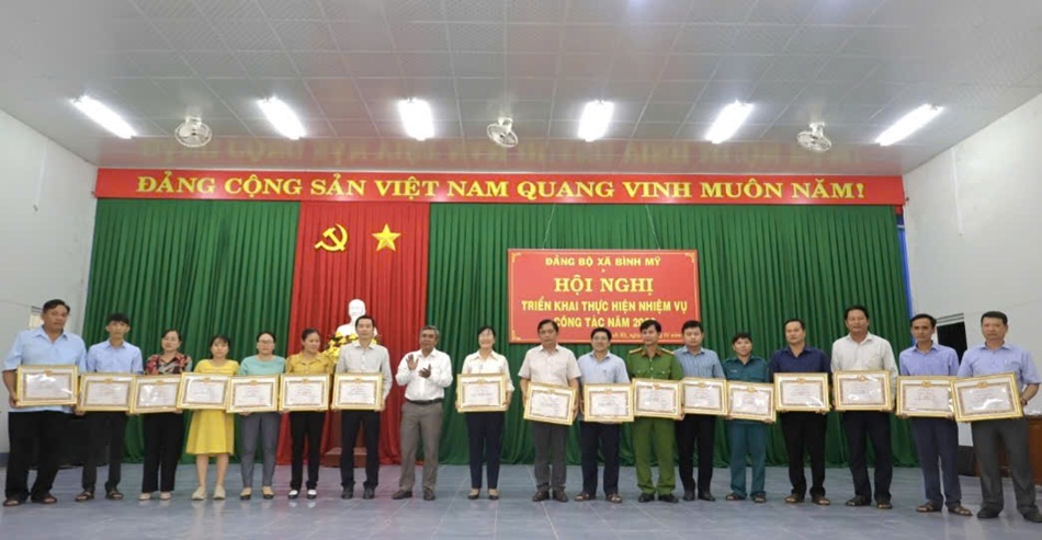 Dịp này, Đảng ủy xã Bình Mỹ đã khen thưởng 06 Chi bộ đạt tiêu chuẩn tổ chức đảng “Hoàn thành xuất sắc nhiệm vụ” năm 2025 và 111 đảng viên “Hoàn thành xuất sắc nhiệm vụ” năm 2025.