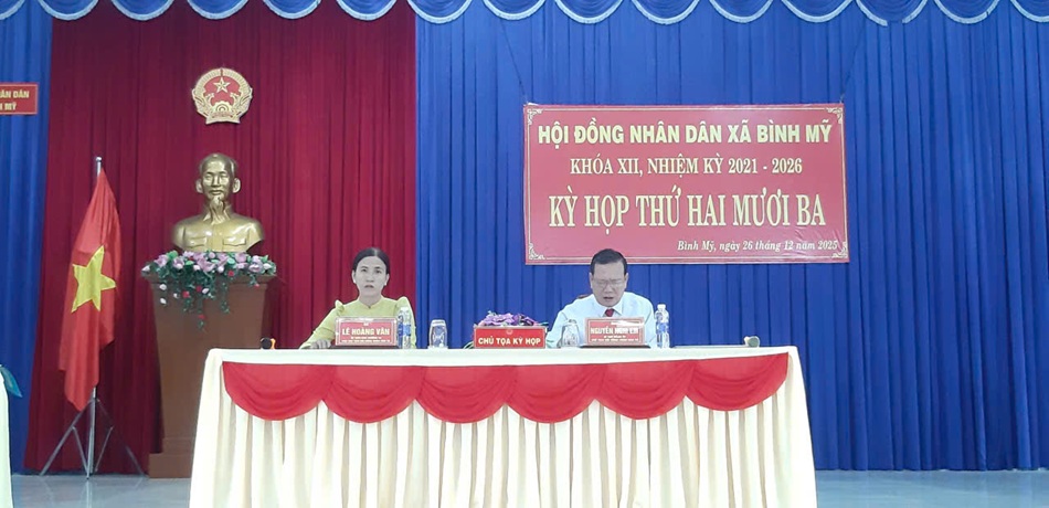 Sáng ngày 26/12/2025;  Hội đồng nhân dân xã Bình Mỹ khóa XII long trọng tổ chức kỳ họp thứ 23 - kỳ họp thường lệ cuối năm 2025. Ông Nguyễn Nghi Em, Bí thư Đảng ủy- Chủ tịch HĐND xã chủ tọa kỳ họp, cùng tham dự có Bà Lê Hoàng Vân- Phó Chủ tịch HĐND xã; đến dự có ông Lê Trung Thành, Phó Bí thư- Chủ tịch UBND xã cùng các đại biểu Hội đồng nhân dân xã.