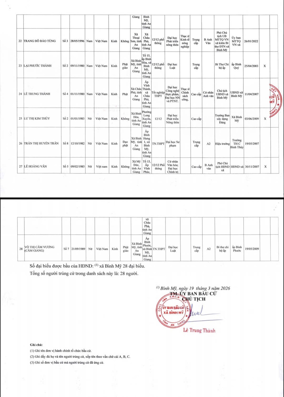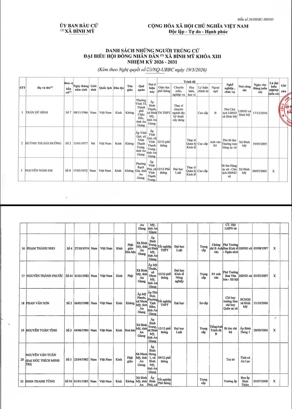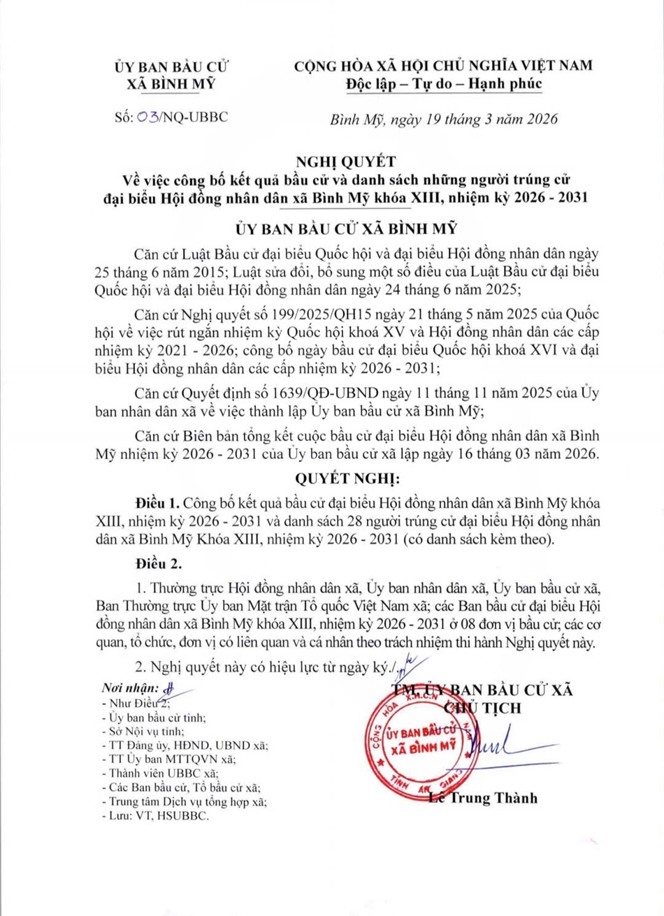 Nghị quyết: Về việc công bố kết quả bầu cử và danh sách những người trúng cử đại biểu Hội đồng nhân dân xã Bình Mỹ khóa XIII, nhiệm kỳ 2026 - 2031