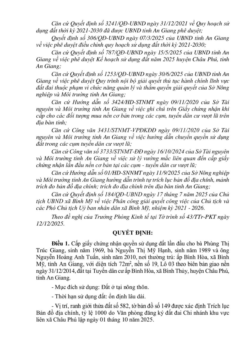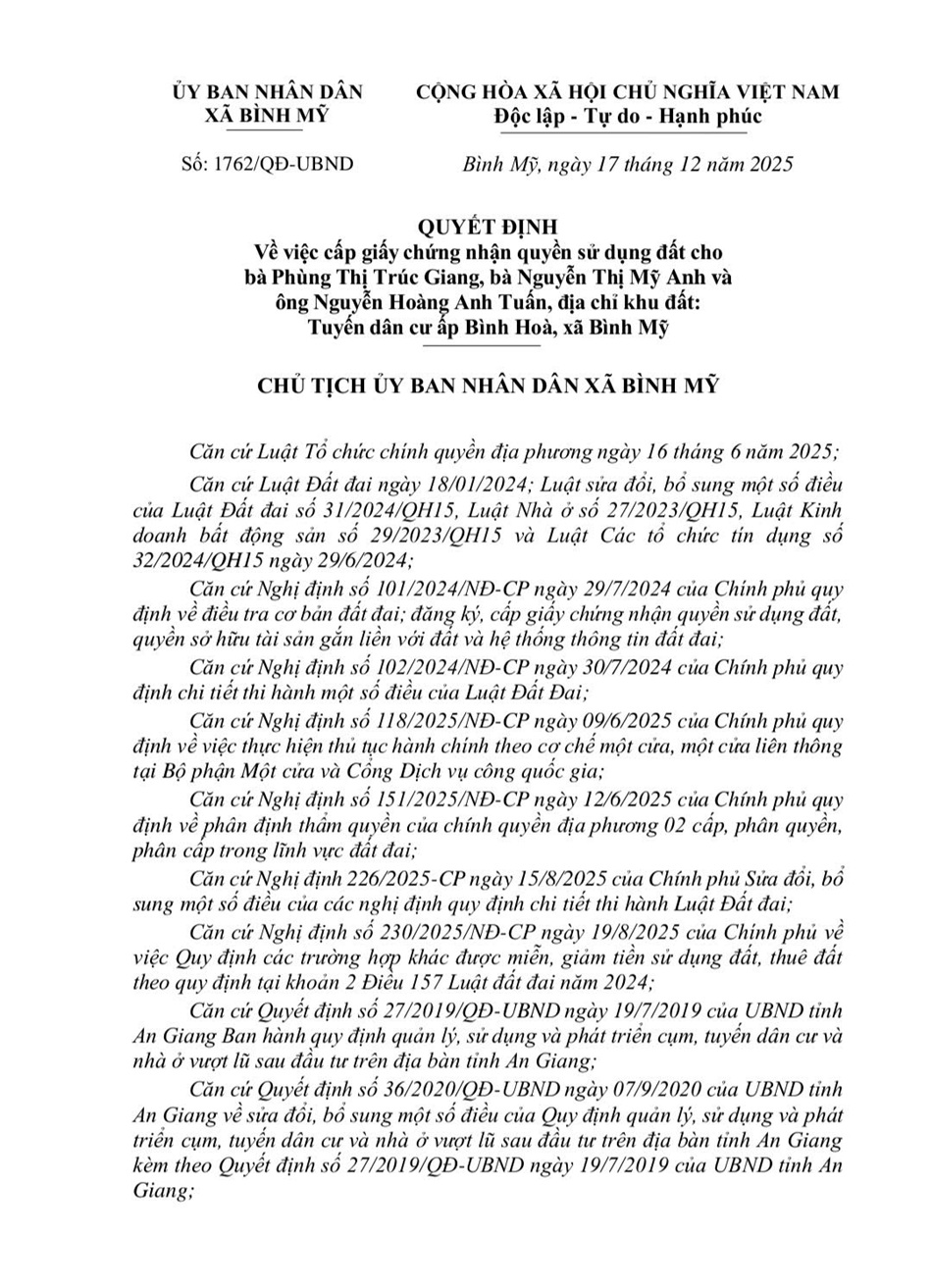 Quyết định về việc cấp giấy chứng nhận quyền sử dụng đất cho bà Phùng Thị Trúc Giang, bà Nguyễn Thị Mỹ Anh và ông Nguyễn Hoàng Anh Tuấn (địa chỉ khu đất: Tuyến dân cư ấp Bình Hòa, xã Bình Mỹ)