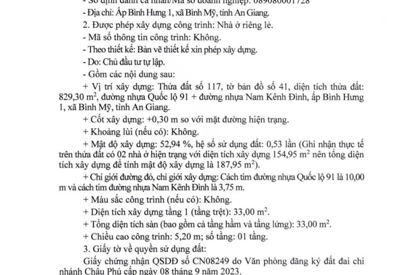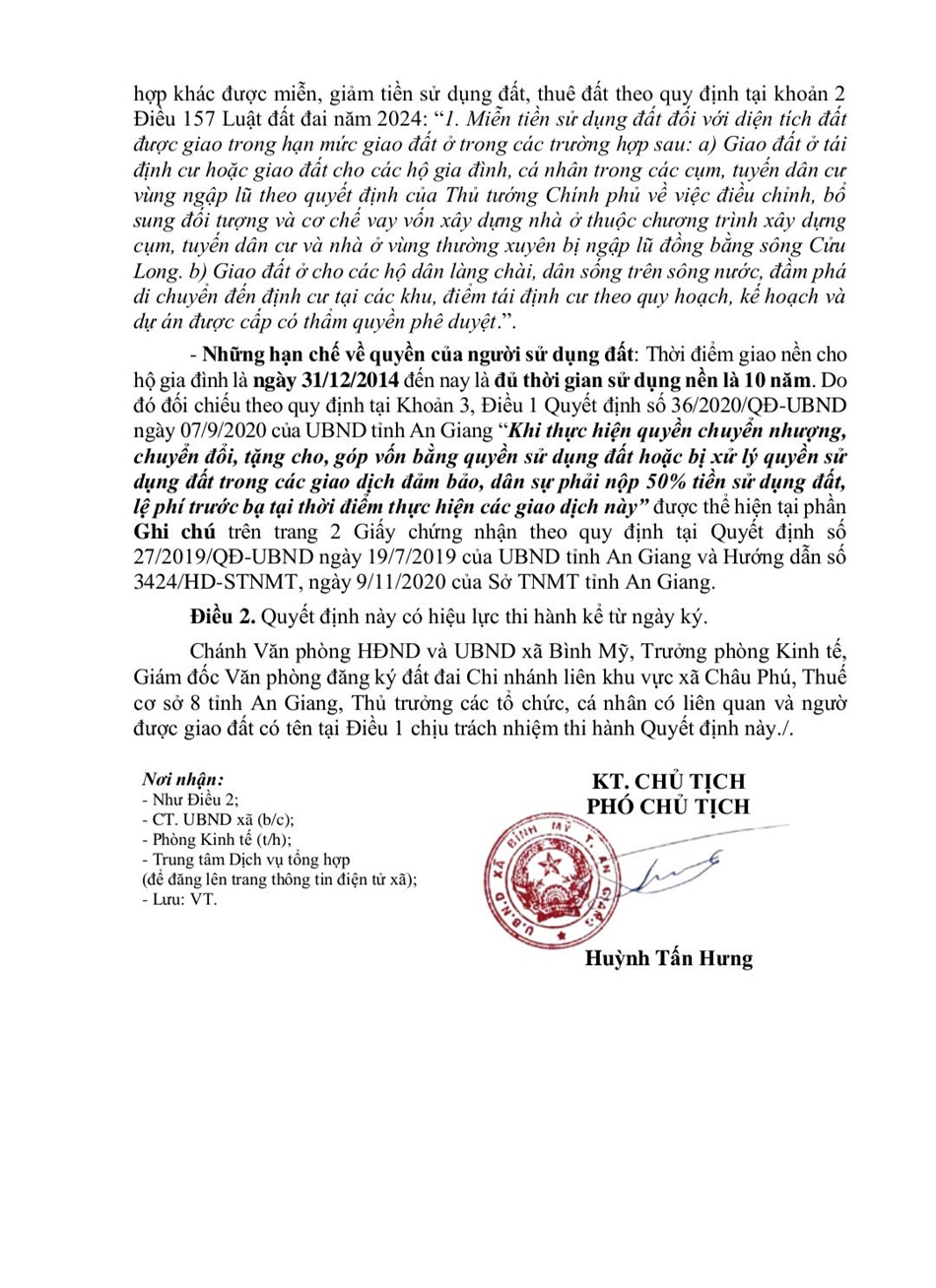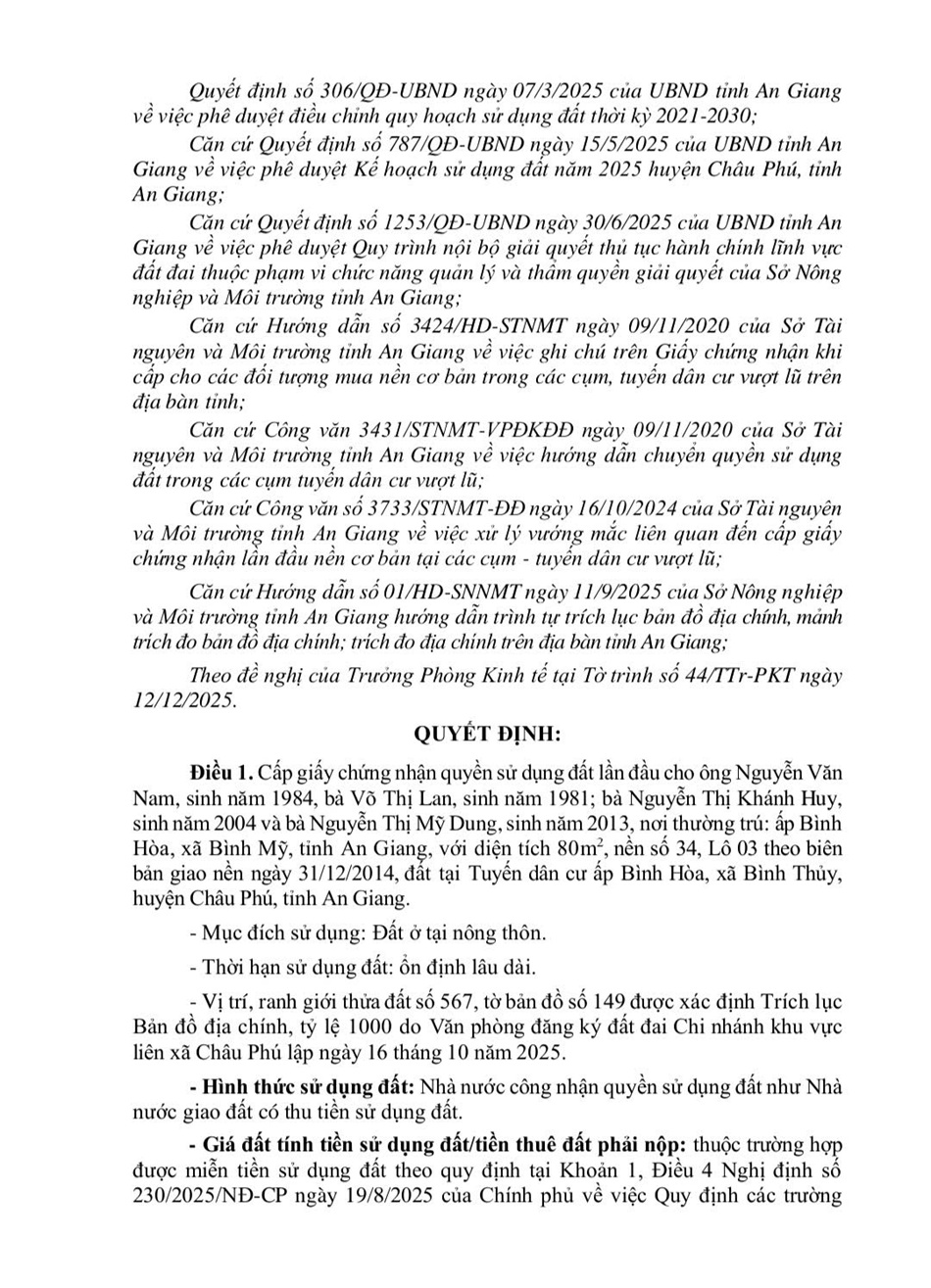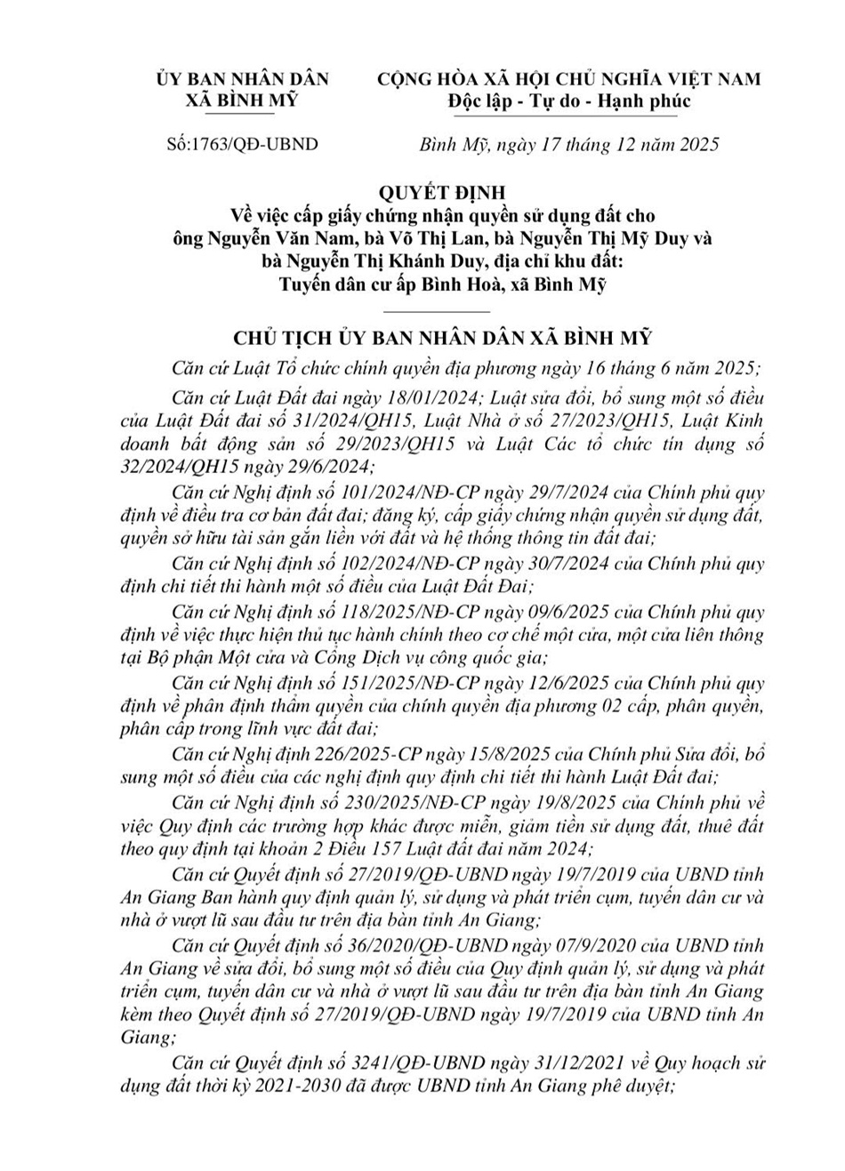 Quyết định: Về việc cấp giấy chứng nhận quyền sử dụng đất cho ông Nguyễn Văn Nam, bà Võ Thị Lan, bà Nguyễn Thị Mỹ Duy và bà Nguyễn Thị Khánh Duy (Địa chỉ khu đất: Tuyến dân cư ấp Bình Hòa, xã Bình Mỹ)