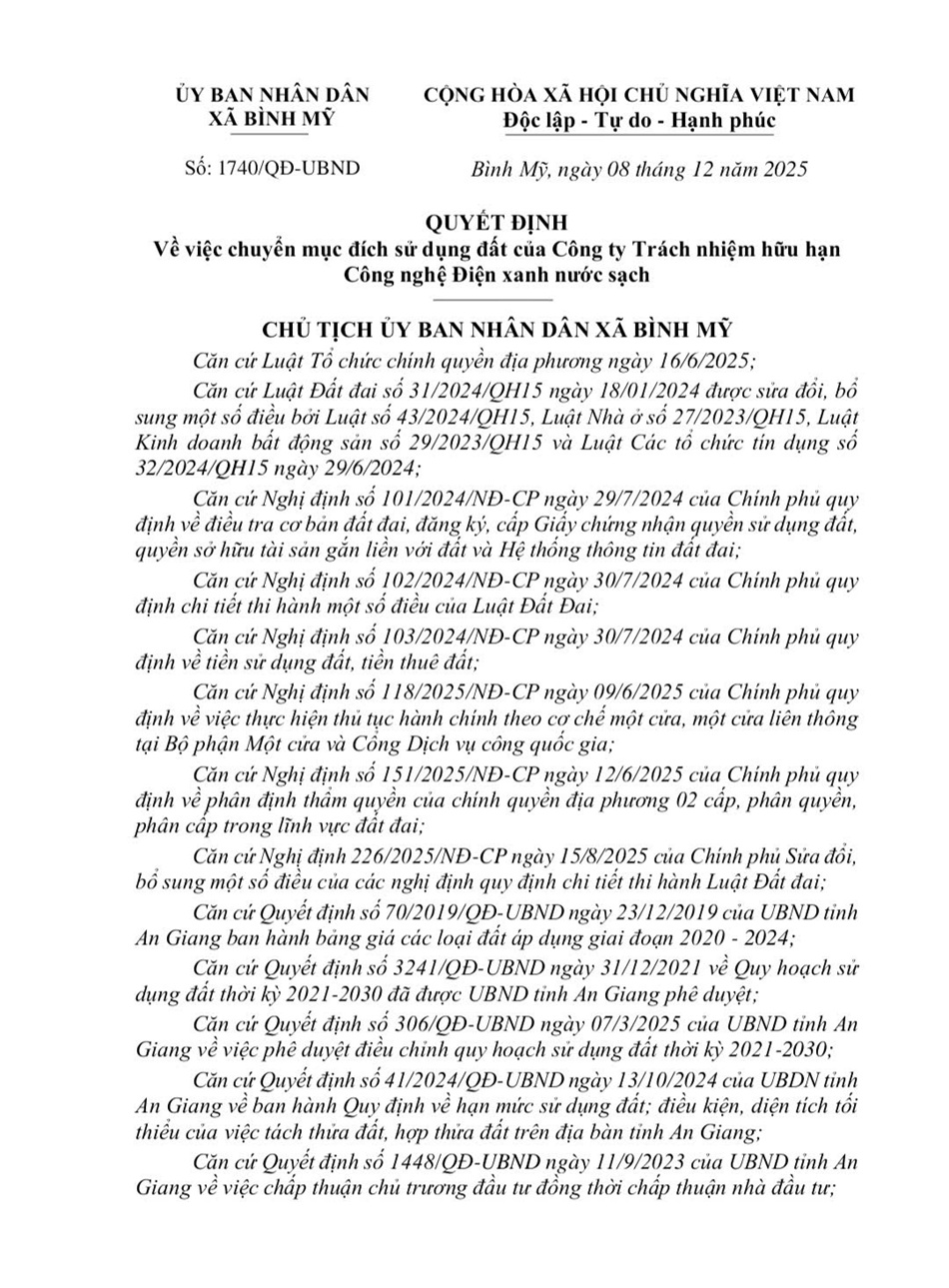 Quyết định về việc chuyển mục đích sử dụng đất của Công ty Trách nhiệm hữu hạn Công nghệ Điện xanh nước sạch