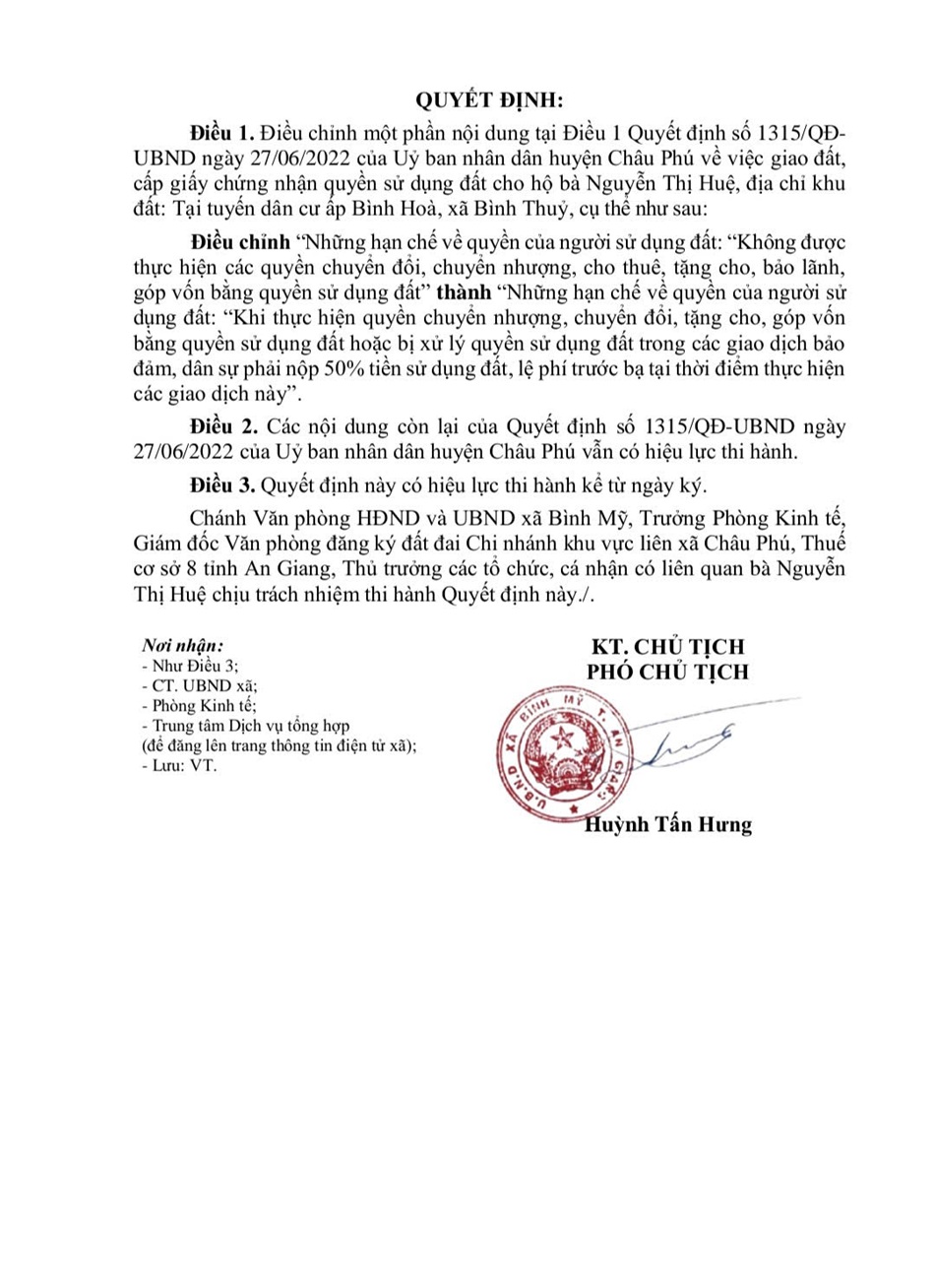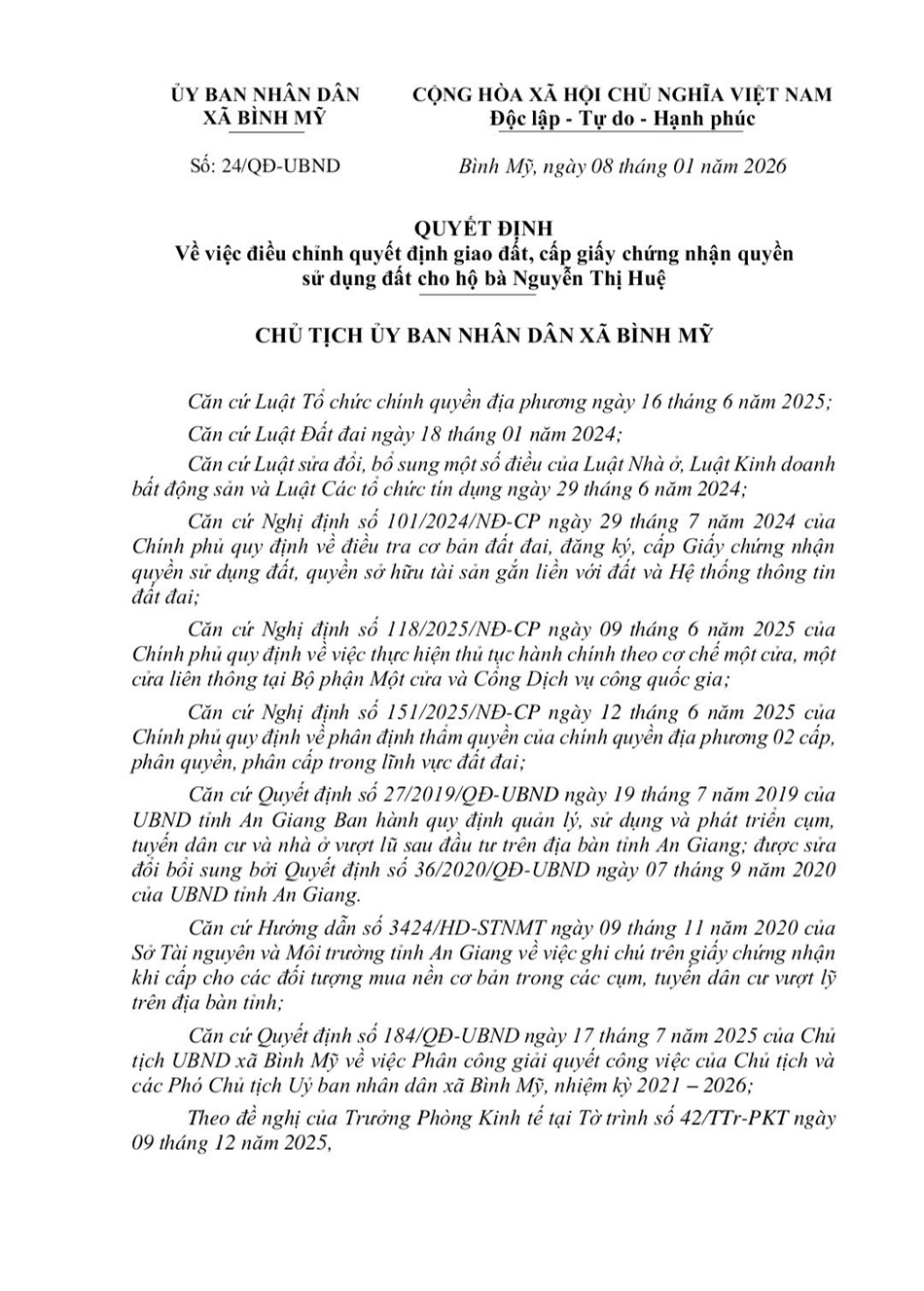 Quyết định: Về việc điều chỉnh Quyết định giao đất, cấp giấy chứng nhận quyền sử dụng đất cho hộ bà Nguyễn Thị Huệ