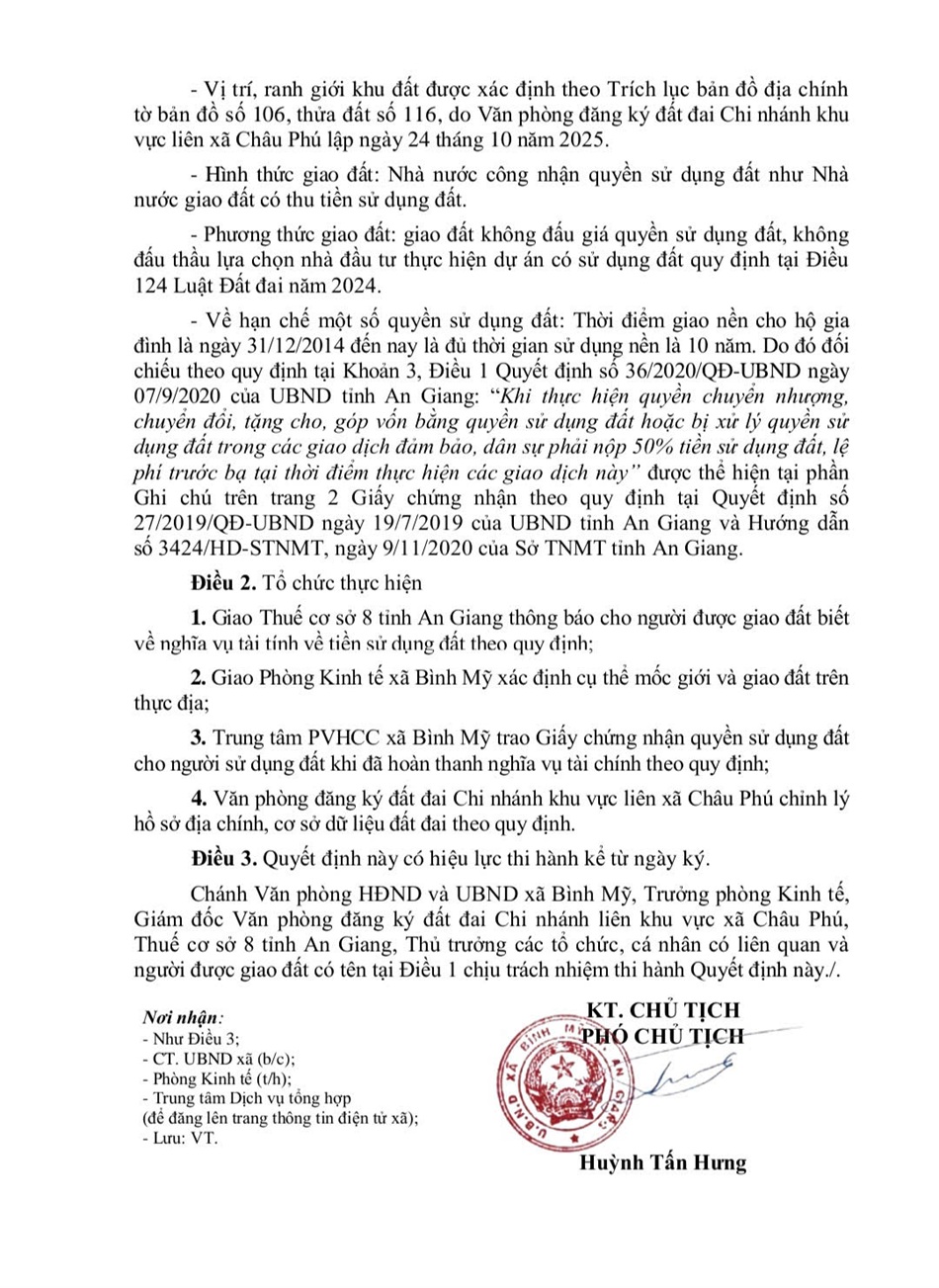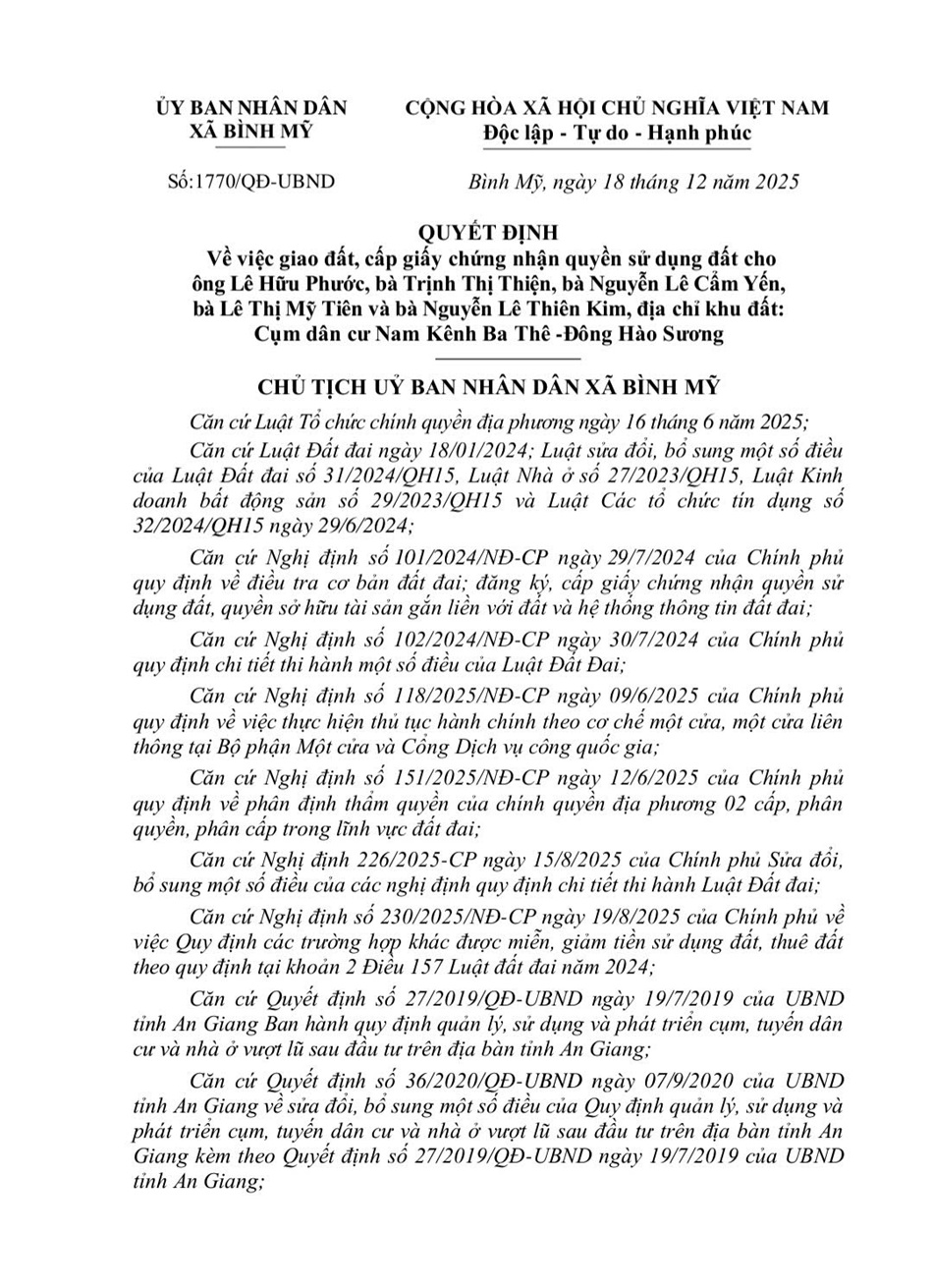 Thông báo Quyết định: Về việc giao đất, cấp giấy chứng nhận quyền sử dụng đất cho ông Lê Hữu Phước, bà Trịnh Thị Thiện, bà Mguyeenx Lê Cẩm Yến, bà Lê Thị Mỹ Tiên và bà Nguyễn Lê Thiên Kim (Địa chỉ khu đất: Cụm dân cư Nam kênh Ba Thê - Đông Hào Sương) 22/12/2025 - aA + Submitted by Biên tập viên on 22 December 2025 Bài viết liên quan Thông báo: Lịch tiếp công dân của Chủ tịch UBND xã Bình Mỹ Quý I năm 2026 12/02/2026 Thông báo: Về việc cấp Giấy phép xây dựng cho Công ty TNHH Công nghệ Điện xanh Nước sạch (Địa chỉ: ấp Bình Hưng 1, xã Bình Mỹ, tỉnh An Giang. 07/02/2026 Thông báo: Về việc nhắc nhở thanh niên đủ điều kiện gọi nhập ngũ trực tiếp nhận Quyết định tại buổi Lễ trao Quyết định gọi công dân nhập ngũ năm 2026 05/02/2026 Thông báo: Về việc cấp giấy phép xây dựng cho ông/ bà Nguyễn Văn Tuấn (Địa chỉ:ấp Bình Thạnh, xã Bình Mỹ, tỉnh An Giang) 05/02/2026 Thông báo: Về việc chủ động phòng trừ bệnh Đạo ôn trong vụ Đông Xuân 2025-2026 05/02/2026 Thông báo: Về việc chủ động phòng trừ bệnh Đạo ôn trong vụ Đông Xuân 2025 - 2026 04/02/2026