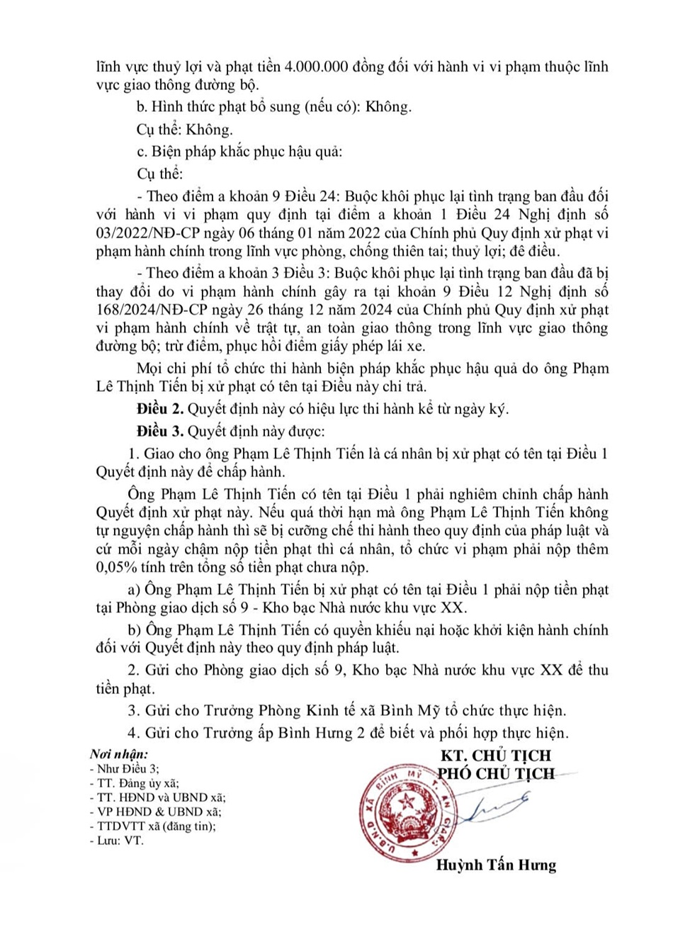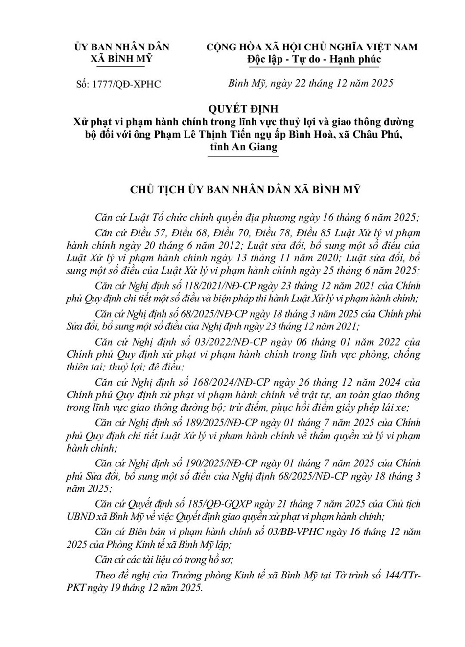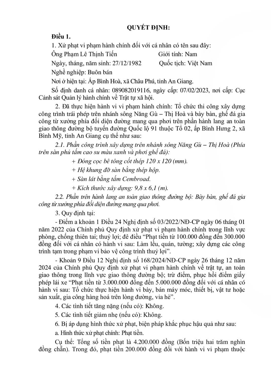 Quyết định xử phạt vi phạm hành chính trong lĩnh vực thủy lợi và giao thông đường bộ đối với ông Phạm Lê Thịnh Tiến (ngụ ấp Bình Hòa, xã Châu Phú, tỉnh An Giang)