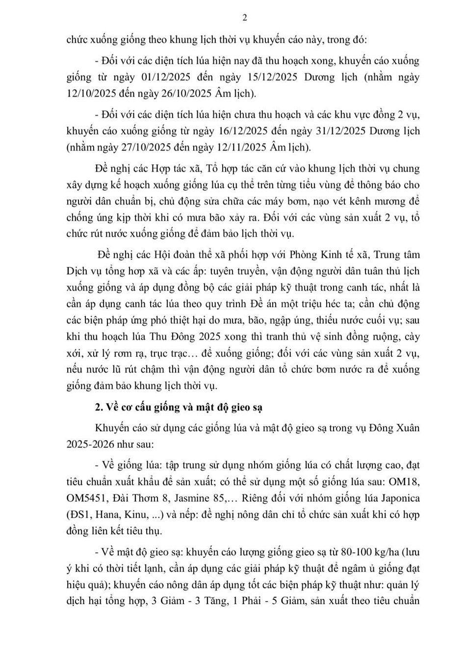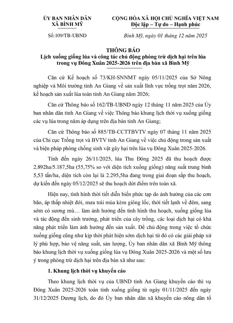 Thông báo: Lịch xuống giống lúa và công tác chủ động phòng trừ dịch hại trên lúa trong vụ Đông Xuân 2025-2026 trên địa bàn xã Bình Mỹ.