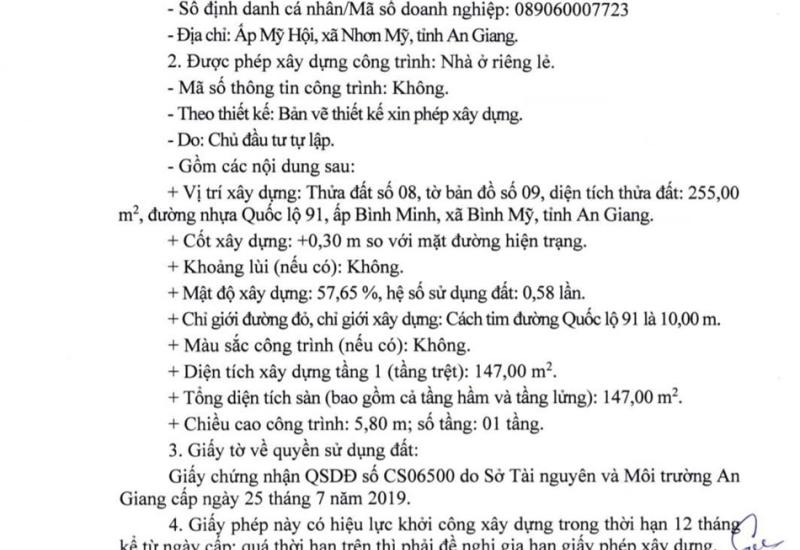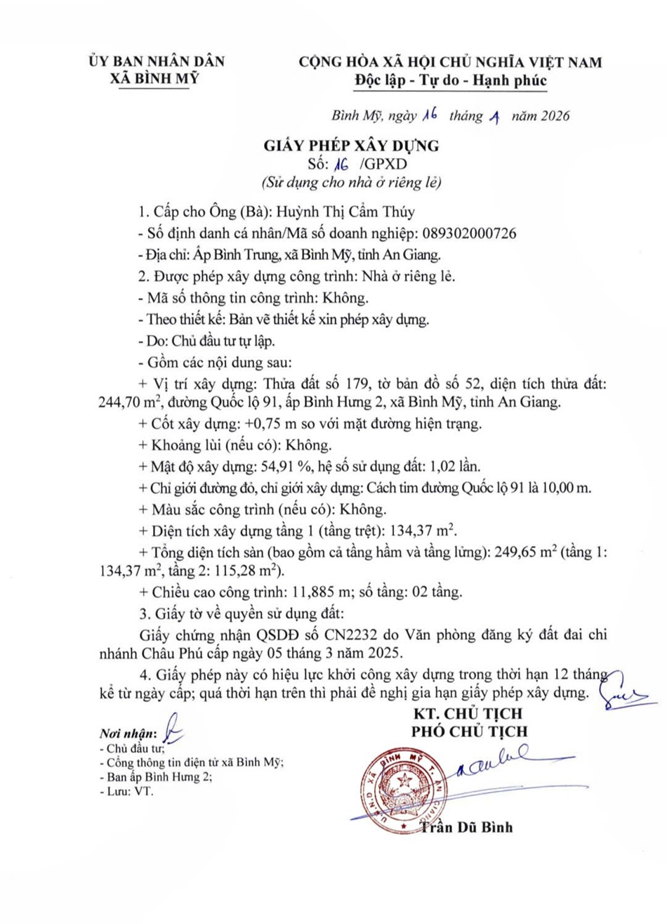 Thông báo: Về việc cấp giấy phép xây dựng cho Ông (Bà) Huỳnh Thị Cẩm Thúy (Địa chỉ: ấp Bình Trung, xã Bình Mỹ, tỉnh An Giang)