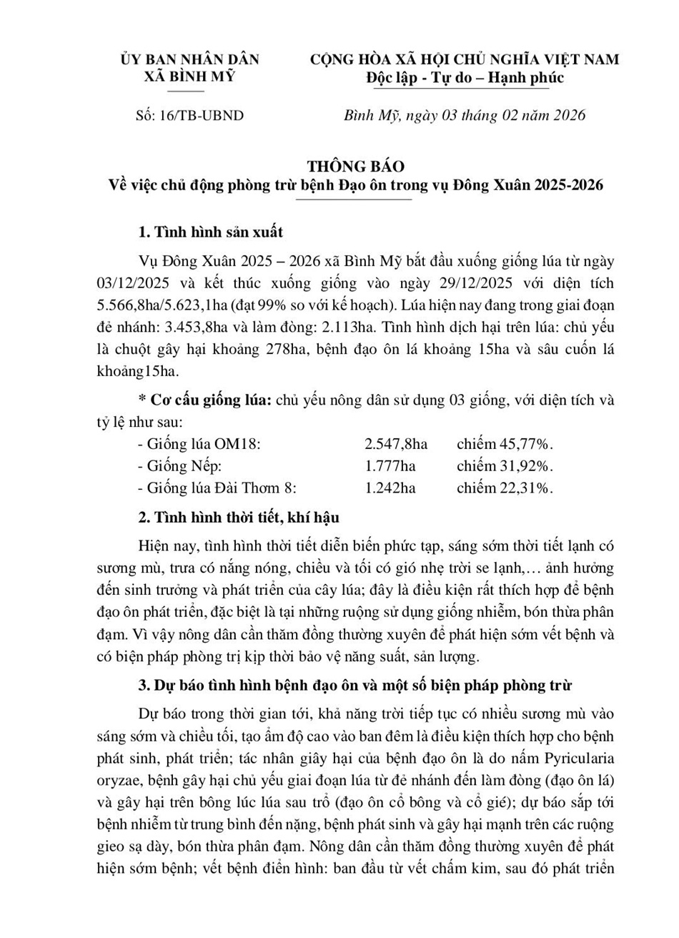Thông báo: Về việc chủ động phòng trừ bệnh Đạo ôn trong vụ Đông Xuân 2025 - 2026