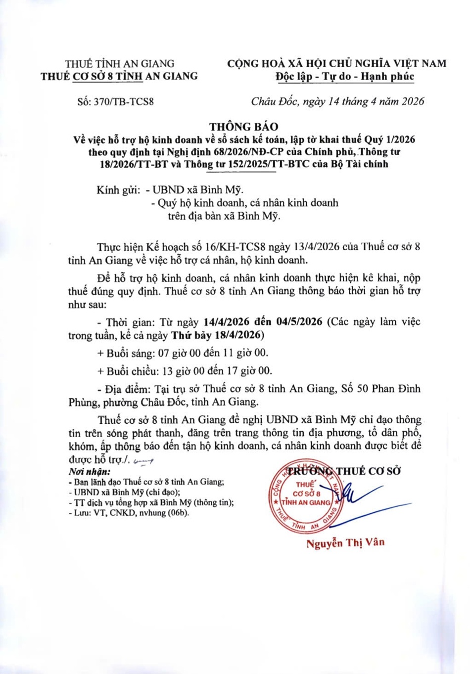 Thông báo: Về việc hỗ trợ hộ kinh doanh về sổ sách kế toán, lập tờ khai thuế Quý I/2026 theo quy định tại Nghị định 68/2026/NĐ-CP của Chính phủ, Thông tư 18/2026/TT-BT và Thông tư 152/2025/TT-BTC của Bộ Tài chính