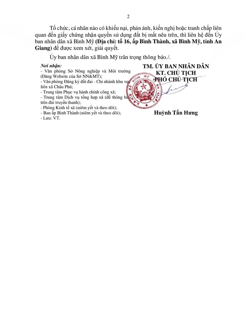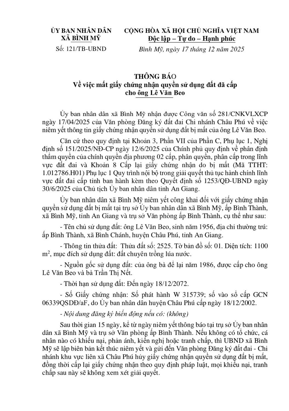 Thông báo: Về việc mất giấy chứng nhận quyền sử dụng đất đã cấp cho ông Lê Văn Beo
