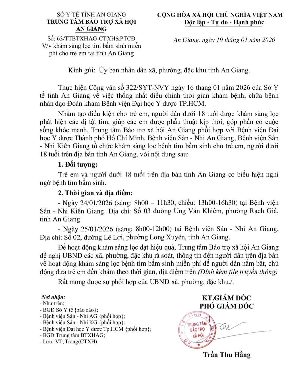 Thông báo: V/v khám sàng lọc tim bẩm sinh miễn phí cho trẻ em tại tỉnh An Giang