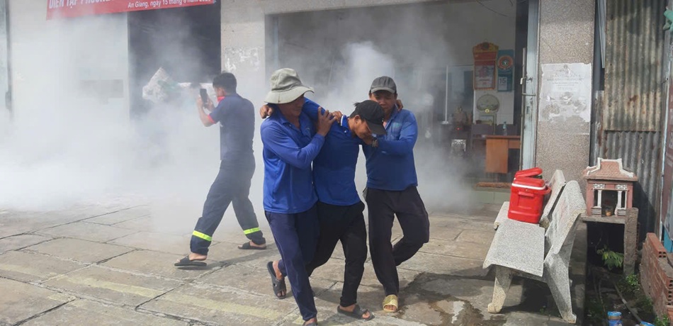Theo tình huống giả định, cháy tại khu vực chứa phân bón và lan sang phòng giao dịch, nguyên nhân do chập điện gây cháy, chất cháy chủ yếu là bàn ghế nhựa, thiết bị máy móc, dây chuyền đường ống kỹ thuật. Do phát hiện đám cháy muộn nên sau gần 05 phút đám cháy mới được phát hiện và báo động cho toàn bộ nhân viên biết, diện tích đám cháy khoảng 50m2. Sự cố cháy xảy ra có 02 người bị thương và mắc kẹt lại bên trong do bị ngạt khói.