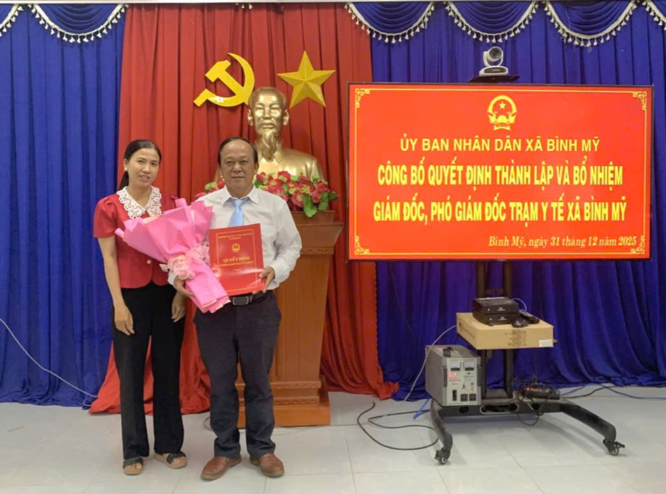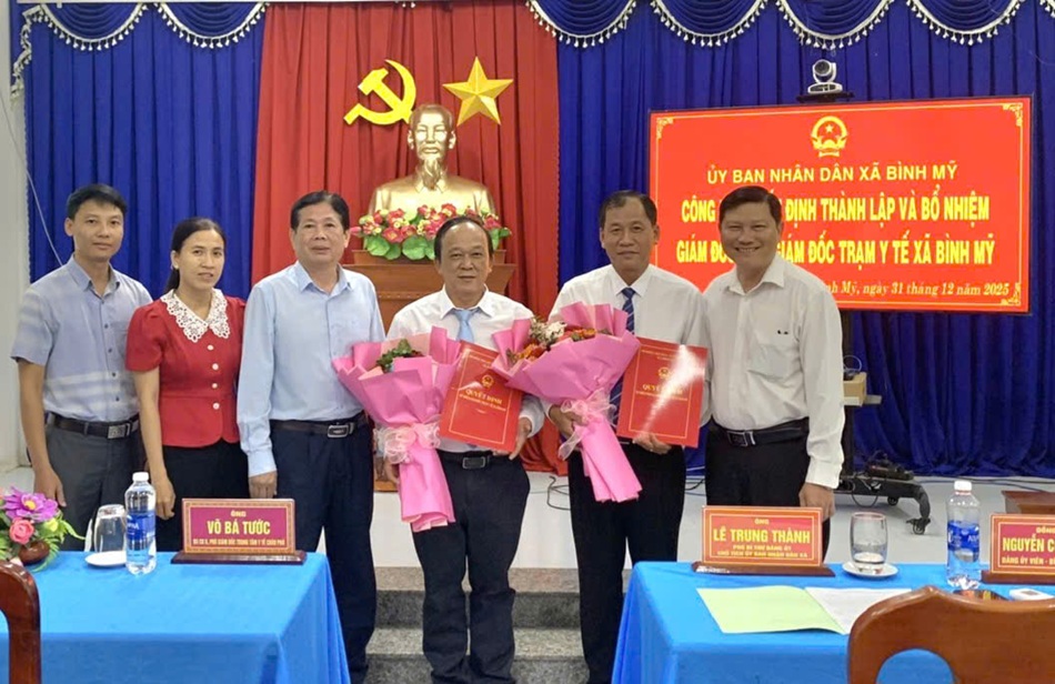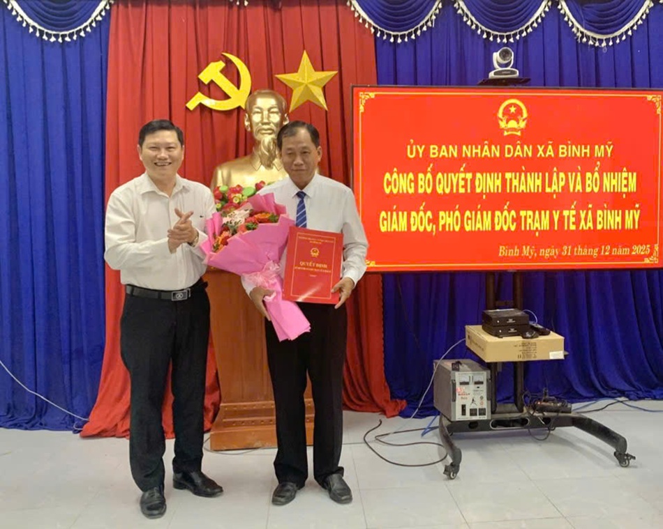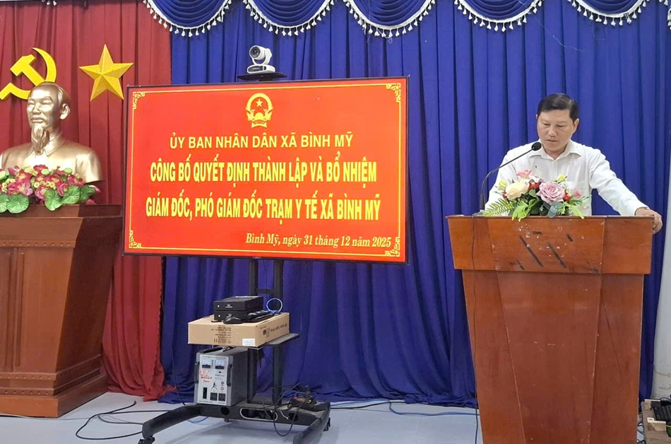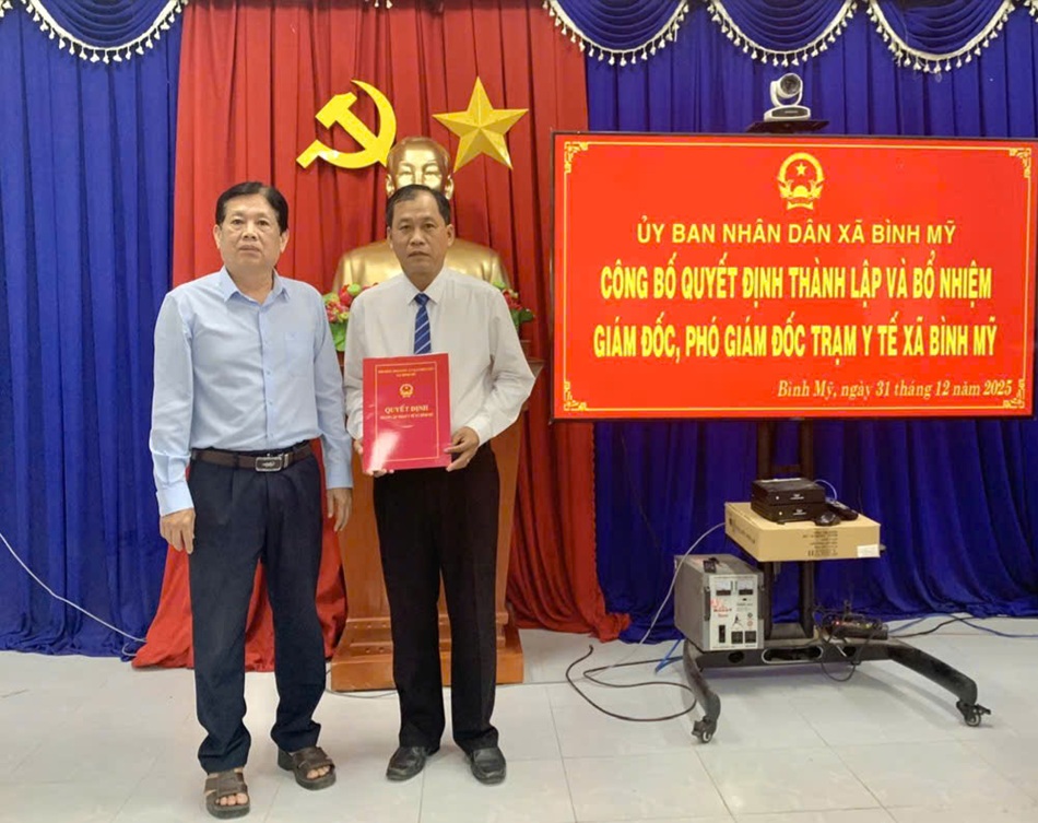 Chiều ngày 31/12/2025, UBND xã long trọng tổ chức Lễ công bố Quyết định thành lập Trạm Y tế xã Bình Mỹ và công bố, trao quyết định bổ nhiệm Ban Giám đốc Trạm Y tế xã, thực hiện theo Quyết định số 2606/QĐ-UBND ngày 28/12/2025 của UBND tỉnh An Giang về việc chuyển giao các Trạm y tế thuộc Trung tâm Y tế trực thuộc Sở Y tế về Ủy ban nhân dân xã, phường, đặc khu.